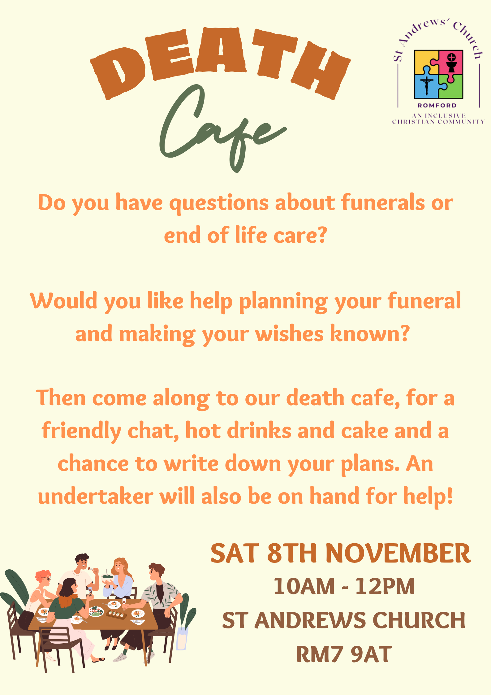 - Death Cafe – Saturday 8th November- 10-12 – A time to come together to talk about dying, final wishes and get help with planning a funeral. An undertaker will also be present for any questions
