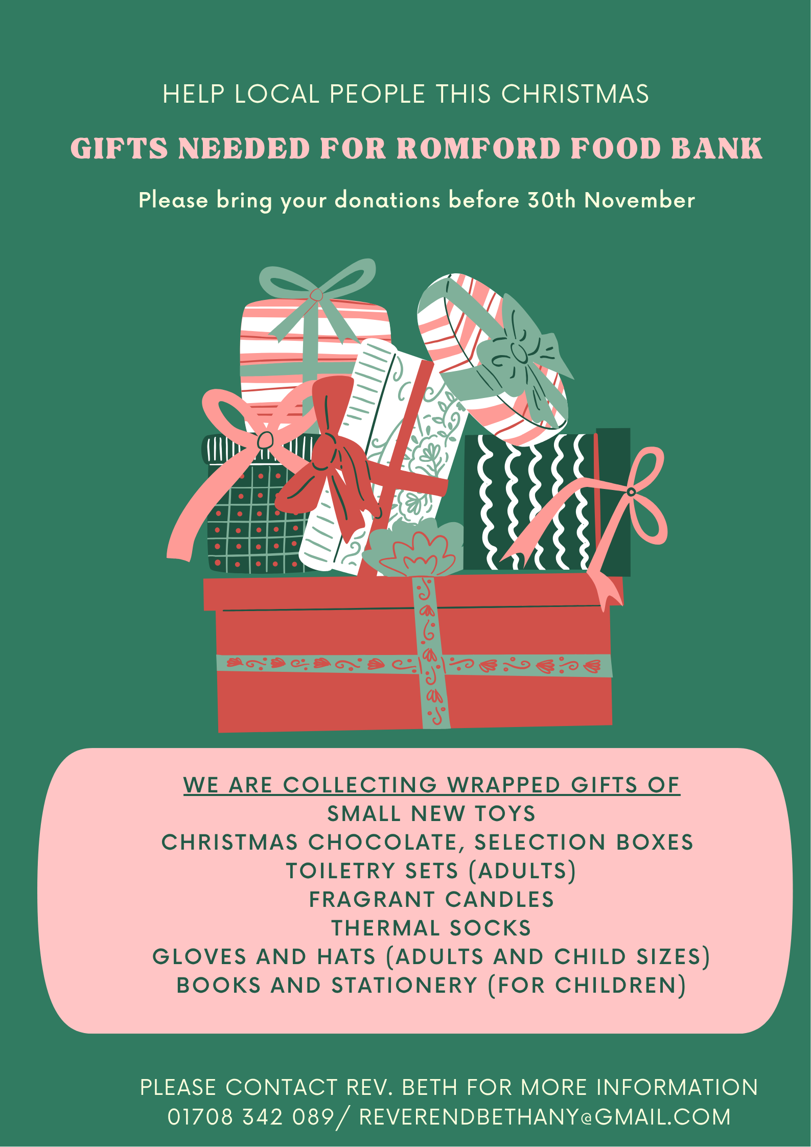 - Foodbank Gifts – We are once again collecting wrapped gifts for the Romford Foodbank, please see this flyer