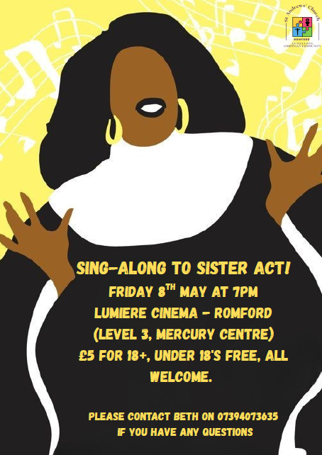 - Sing-Along Sister Act – Friday 8th May 7pm Lumiere, Romford. £5 for 18+, under 17’s free – All welcome