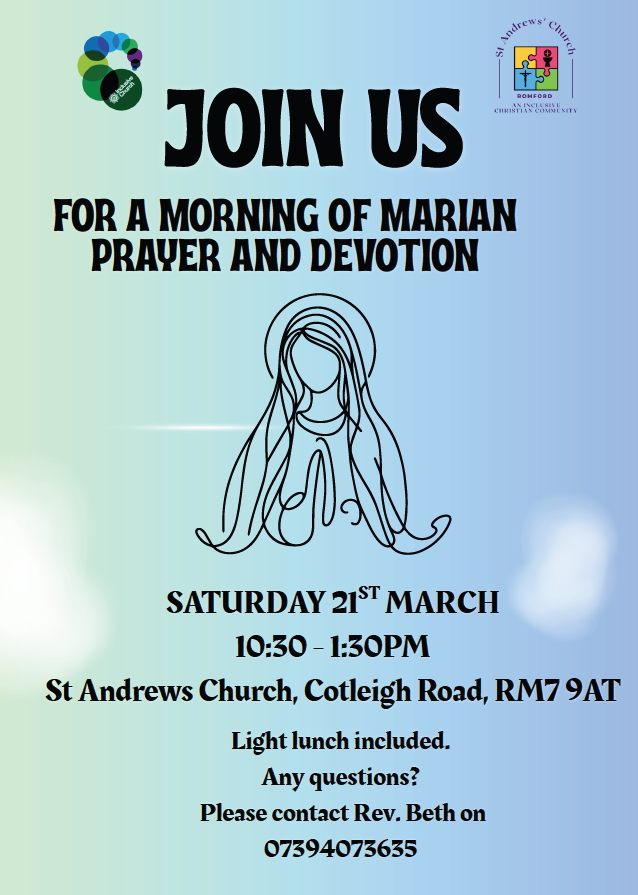 - Saturday 21st March 10:30am – 1:30pm – Please join us for a morning of Marian devotion with readings, prayers, rosary and a Mass. Light lunch included, all welcome.